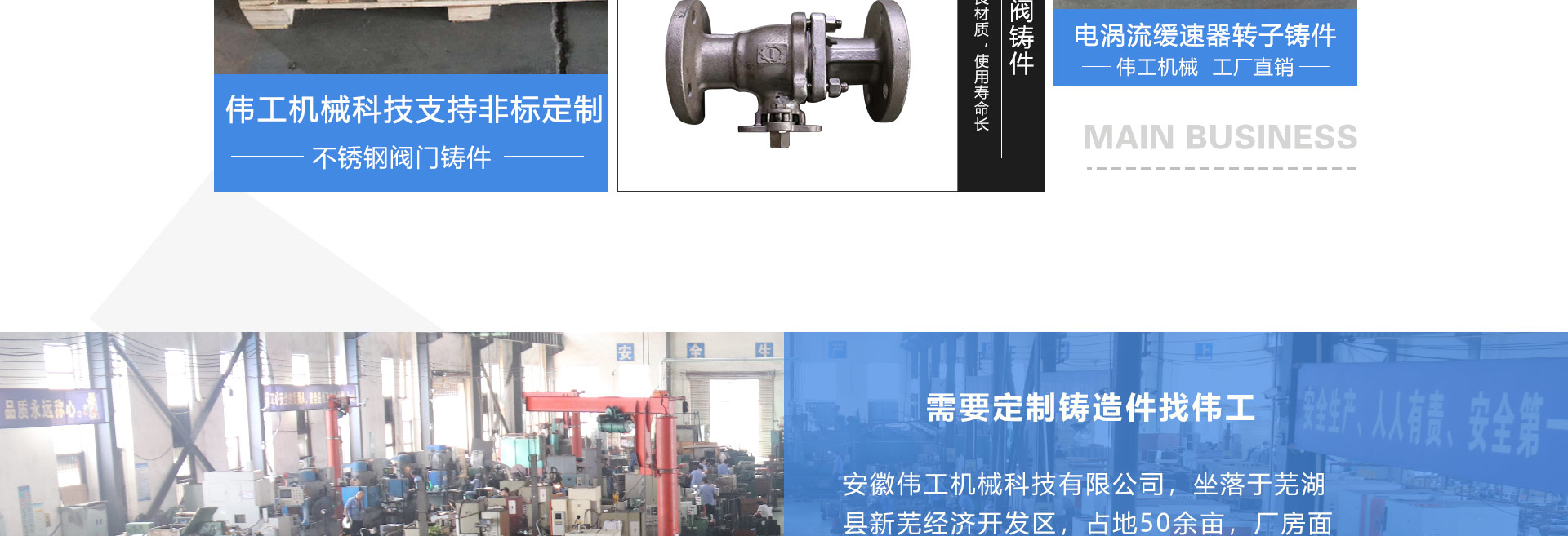 安徽偉工機械科技有限公司,坐落于安徽蕪湖新蕪經濟開發區,是一家専業從事鑄造產品設計、研發、生產、銷售于一體的企業,公司為客戶的產品提供多樣的技術支持與設計,公司主要鑄造技術有潮模砂鑄造、硅溶膠精鑄工藝。主要產品有:不銹鋼閥門配件、泵閥配件、汽車配件、工業管道配件、工程機械配件、汽車配件等。材質為:低合金鋼、304、316、316L、鉻鉬鋼、哈氏合金、碳鋼、雙相鋼等。公司已先后通過ISO9001和TS16949等多種體系審核,以完備的管理手段和齊全的檢測設備滿足客戶需求,進的設備,専業的技術,嚴謹的管理,穩定的質量。服務客戶,鑄造未來,偉工誠摯的歡迎新老客戶共同商洽合作